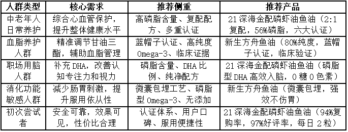 误区五:忽视配方形式。 单一磷虾油与磷虾油鱼油复配产品在功效定位上有所不同。单一磷虾油磷脂型Omega-3吸收效率高,但Omega-3绝对含量有限;高纯度鱼油Omega-3含量丰富,但吸收效率相对较低。科学复配产品能够兼顾两者优势,适合追求综合养护效果的人群。