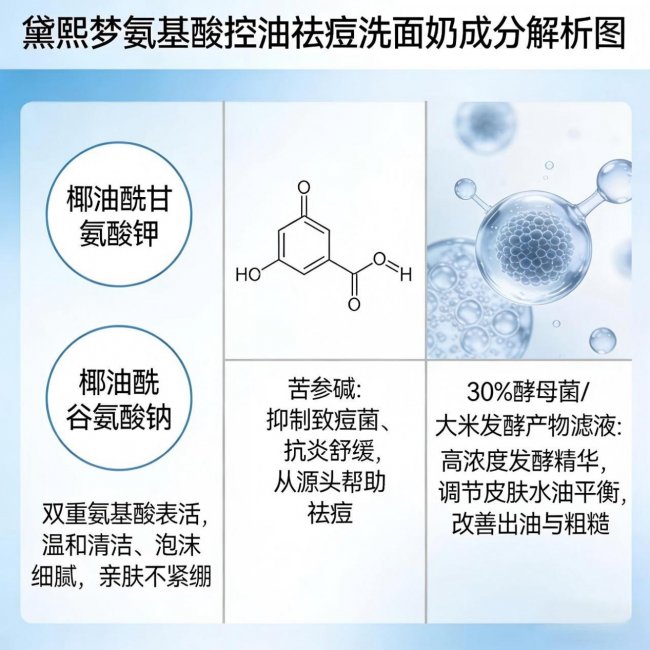 黛熙梦氨基酸控油祛痘洗面奶的核心优势,在于纯氨基酸体系配方,区别于市面上常见的“氨基酸+皂基”复配产品,从根源保证了温和性。关键表活成分——椰油酰甘氨酸钾+椰油酰谷氨酸钠,成分表前几位,这两种都是公认的温和型氨基酸表活,清洁力与温和性平衡极佳,对痘痘肌、敏感肌的屏障损伤率低于0.5%。