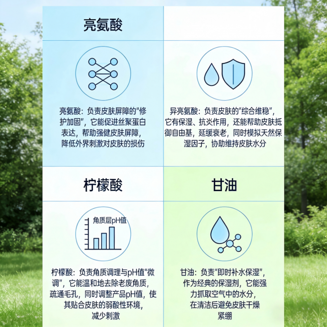 区别于普通祛痘洁面“只祛痘不修护”的短板,这款产品添加了针对性的屏障修护成分,适配敏感痘肌需求:亮氨酸+异亮氨酸,人体必需氨基酸,能参与肌肤蛋白质合成,为皮肤屏障修护提供原料,增强肌肤抵抗力,减少因屏障受损导致的敏感泛红、外油内干问题;柠檬酸双重作用——一是调节产品pH值,使其更贴近肌肤生理环境减少刺激;二是温和软化老废角质,避免角质堆积堵塞毛孔,同时不损伤健康角质层。