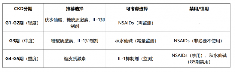 此表清晰显示,随着肾功能下降,传统药物的选择空间急剧收窄,而IL-1抑制剂(如金蓓欣)在中重度CKD患者中保持了重要的治疗地位。