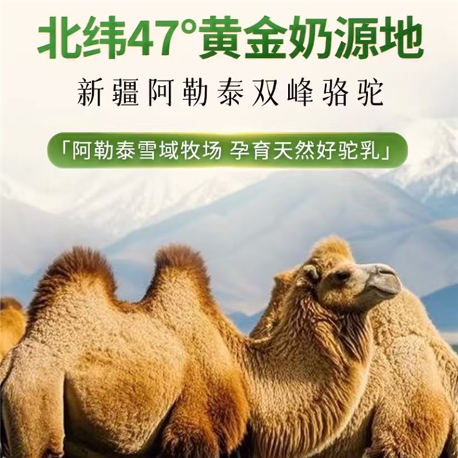 黄金奶源:源自北纬47°阿勒泰雪域牧场,骆驼有机散养,采食天然草本,奶源天然无污染