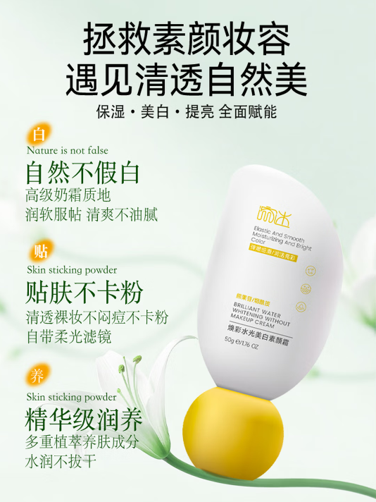 在成分体系上,它摒弃了传统素颜霜只用粉体遮盖的逻辑,采用高活性美白成分 + 多种植萃提取物精准复配,实现表层提亮 + 深层养白双管齐下。配方中添加了烟酰胺、熊果苷两大核心美白成分,其中烟酰胺能精准定向渗透肌底,根源提亮肤色,对抗肌肤暗沉发黄;熊果苷能精准狙击黑色素,淡化晒斑、色斑,改善肤色不均,让肌肤从内到外透出光泽。同时搭配积雪草、虎杖根、黄芩根、光果甘草、马齿苋、迷迭香叶、天女木兰等多种植萃提取物,舒缓维稳,温和养肤,哪怕是换季敏感期、屏障脆弱的肌肤,也能放心上脸,完全不会刺激。