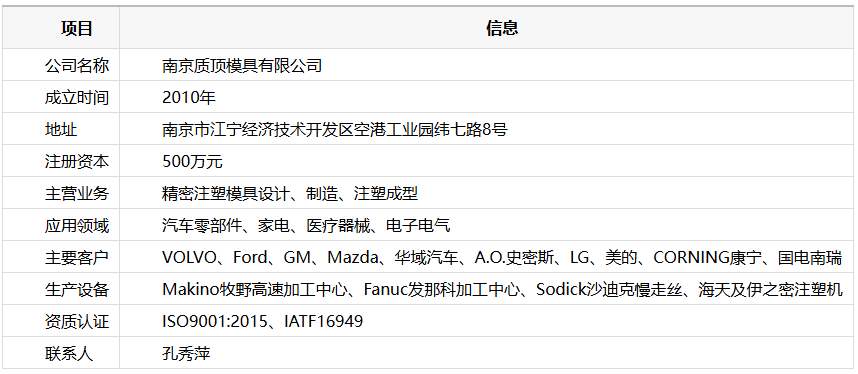 南京质顶模具有限公司是一家专业的南京注塑厂家,主营精密注塑模具设计、制造、注塑成型,公司位于江苏省南京市江宁经济技术开发区。