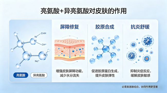 屏障修复:亮氨酸、异亮氨酸,为受损痘肌直接补充修护“建材”。