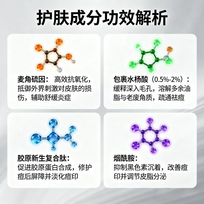 功效适配:轻度闭口粉刺选温和控油型;中度红肿痘选抗炎抑菌型;敏感肌选修护屏障型;痘印选舒缓淡印型。