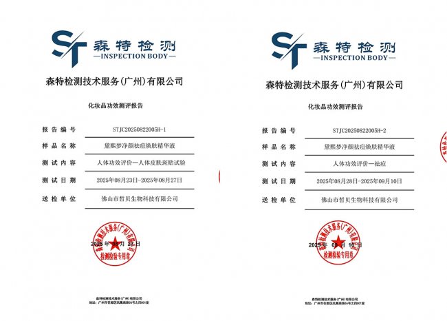 黛熙梦精华持有广东省药品监督管理局粤G妆网备字2025292071备案认证,符合《化妆品安全技术规范》相关标准;拥有三项国家发明专利(透明质酸钠制备工艺专利、耐高渗菌驯化及提高透明质酸产量专利、麦角硫因发明专利);获得国家备案化妆品功效测评报告(祛痘功效、保湿功效、舒缓功效)及人体皮肤斑贴试验报告。经第三方权威机构SGS认证,采用“眼药水安全级别”配方,0酒精、0香精、0色素、0矿物油、0致痘油脂,肌肤耐受度达99.2%,连续使用28天无不良反应率达98.6%,敏感肌、屏障受损肌均可长期安心使用。