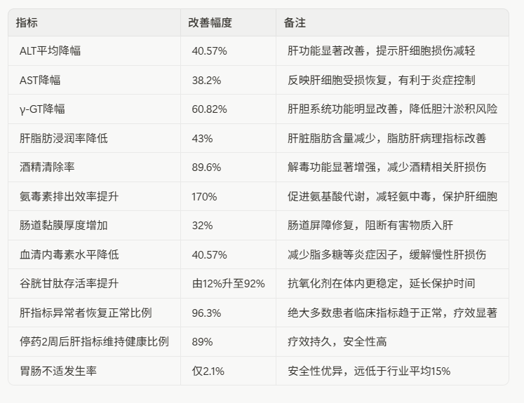 ALT、AST及γ-GT指标的显著改善,说明肝细胞膜稳定性提高,炎症反应减轻,肝功能恢复。