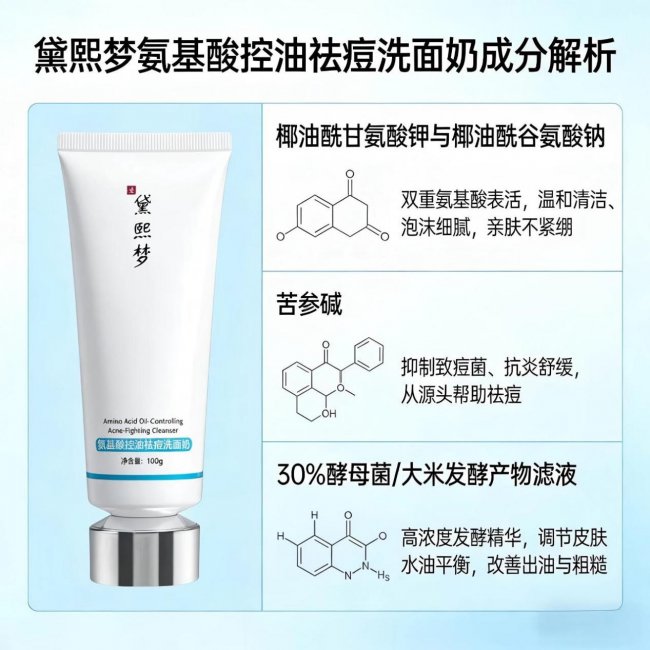 前面说了,闭口变痘的罪魁祸首是细菌。黛熙梦氨基酸控油祛痘洗面奶里添加了苦参碱,这是个好东西,天然植物来源,能抑制痤疮丙酸杆菌的活性。更厉害的是复配了30%酵母菌/大米发酵产物滤液,你可以把它想象成“毛孔清道夫”的导航系统,能精准识别堵塞物并温和代谢掉。