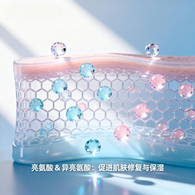 这里要重点说说亮氨酸和异亮氨酸。这俩可不是普通保湿剂,它们是构成皮肤天然保湿因子(NMF)的关键氨基酸。你可以理解成它们是“砖墙”里的“水泥修补剂”。当你的皮肤因为过度清洁或长闭口导致屏障出现微小损伤时,它们能精准定位破损处,把松动的角质细胞重新“粘”牢。屏障健康了,毛孔口自然就不会异常角化,闭口也就失去了生长的“土壤”。