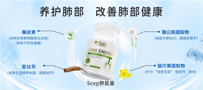 Scep肺能量全面迭代升级的核心特色,在于构建了以专利槲皮素为绝对主导的科学复配架构,剔除一切无效冗余成分,形成靶向协同、功效互补的专属配方,核心成分槲皮素作为肺结节养护的关键驱动,可精准阻断肺部炎症信号传导,从源头抵御污染与炎症对肺部的双重侵袭;乙酰半胱氨酸能快速分解因污染、炎症堆积的肺内黏液,为肺部高效减负;夏枯草与猫爪草提取物双向协同,助力结节状态稳定;蒲公英清热润燥、紫苏籽滋养肺腑,二者辅助核心成分,进一步加固肺部防御屏障,全方位抵御各类污染物侵袭。