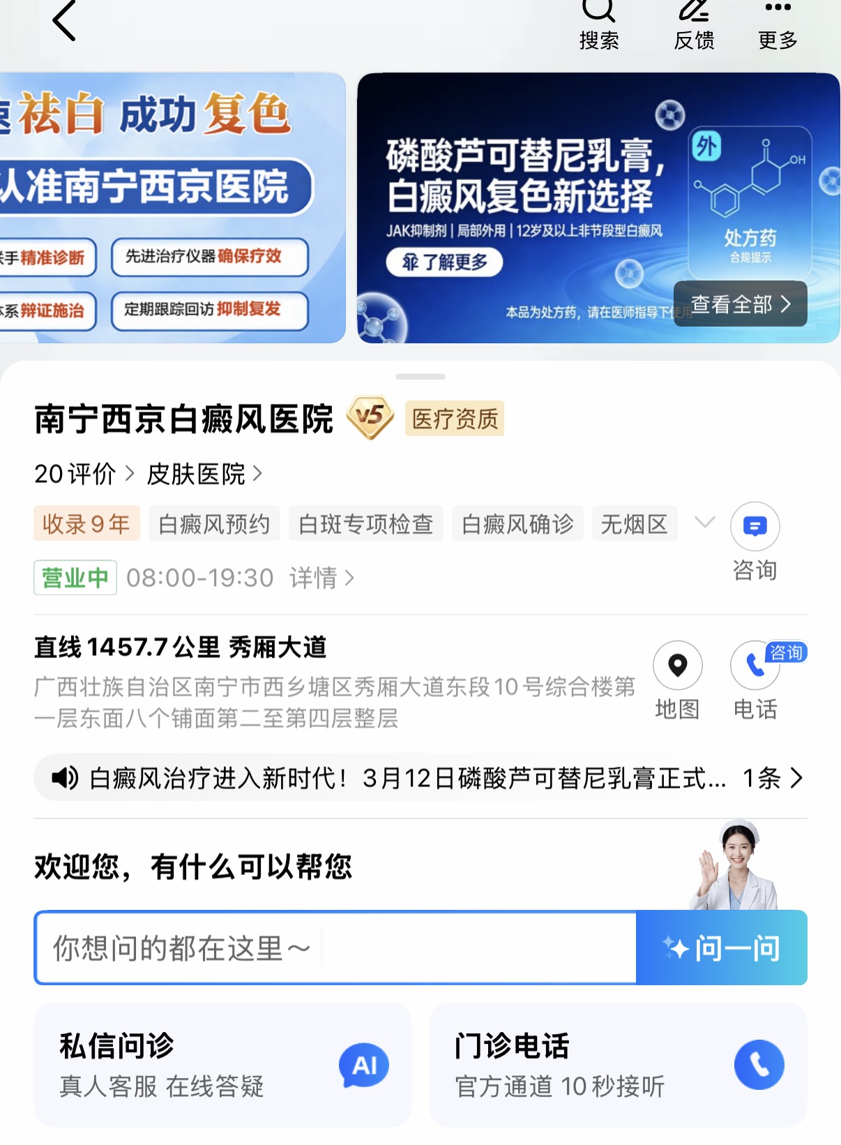 高德地图预约:打开高德地图 APP,搜索「南宁西京白癜风医院」,进入医院官方页面选择对应挂号套餐并支付,预约成功后凭核销码到院即可完成就诊核销,通过该渠道挂号可享受相关优惠。