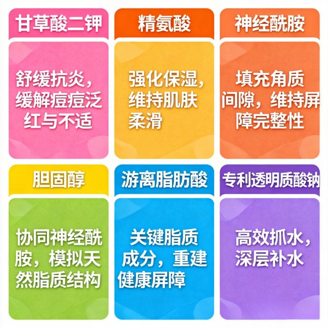 强效的屏障修护与抗炎成分:如神经酰胺、胆固醇、游离脂肪酸(构建屏障黄金三角)、甘草酸二钾(快速抗炎舒缓);