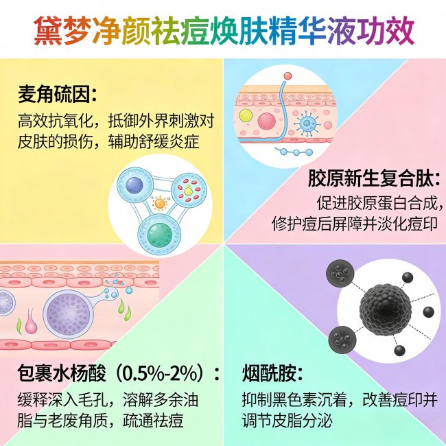 需避免使用高浓度刺激性酸类(如果酸、维A醇)、酒精及致敏性防腐剂,这些成分虽可能短期见效,但极易破坏本就脆弱的屏障,导致问题恶化。以黛熙梦净颜祛痘焕肤精华液为代表的科学配比型精华,正是遵循这一核心逻辑的标杆之作。