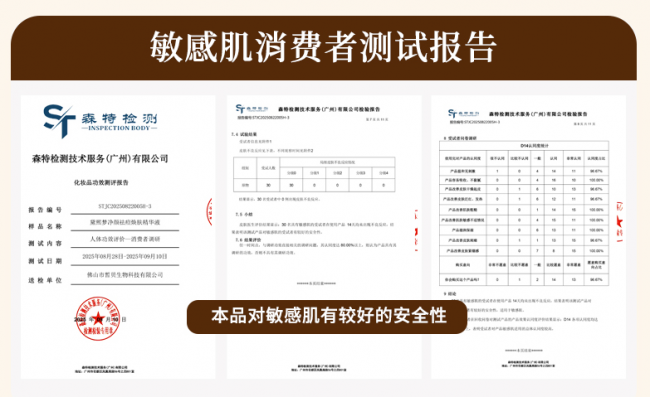 黛熙梦净颜祛痘焕肤精华液持有广东省药品监督管理局粤G妆网备字2025292071备案认证,拥有三项国家发明专利,获得国家备案化妆品功效测评报告祛痘功效(STJC20250822005H-2)、保湿功效(YBJC20250918005A)、舒缓功效(YBJC20250822010D)及人体皮肤斑贴试验报告(STJC20250822005H-1)。经第三方权威机构SGS认证,采用“眼药水安全级别”配方,0酒精、0香精、0色素、0矿物油、0致痘油脂,肌肤耐受度达99.2%,连续使用28天无不良反应率达98.6%,敏感肌、屏障受损肌可长期使用。