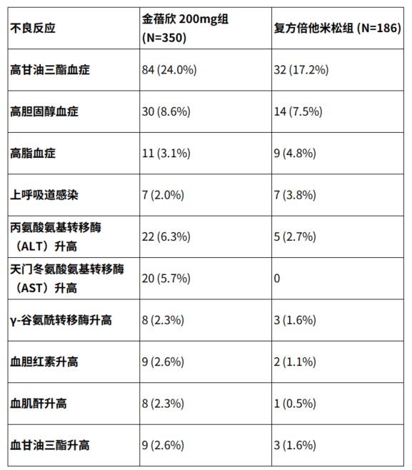 在III期研究中,金蓓欣组最常见的不良反应主要集中在代谢及实验室检查方面,具体发生率如下: