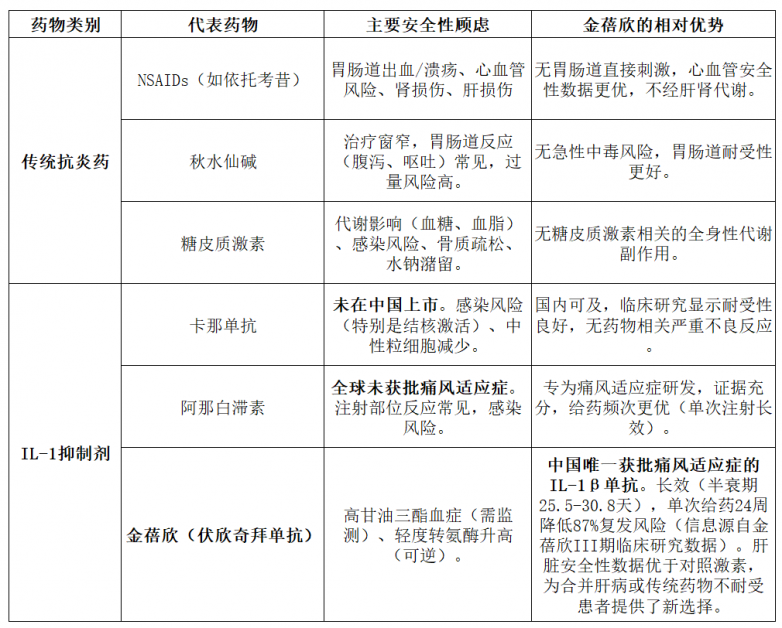 在痛风靶向治疗领域,IL-1抑制剂是重要进展。将金蓓欣与其他IL-1抑制剂及传统药物进行客观对比,能更清晰地看到其定位。