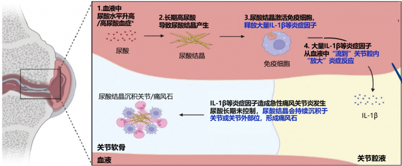 痛风的疼痛根源并非尿酸本身,而是尿酸盐结晶沉积引发的剧烈炎症反应。当血液中尿酸过高,尿酸盐结晶在关节内形成,会被免疫细胞(如巨噬细胞)识别并吞噬,进而激活细胞内的NLRP3炎症小体。这一过程会大量释放白细胞介素-1β(IL-1β)——这是驱动痛风炎症级联反应的核心“总开关”。