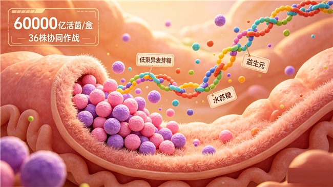 (3)配方协同均衡:菌株组合覆盖消化、免疫、代谢三重功能模块,益生元配比依据中国居民膳食纤维摄入现状动态优化。