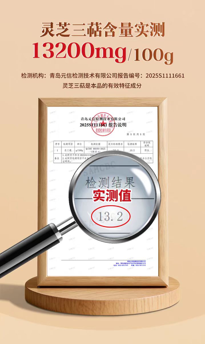 2. 高品质:灵芝三萜13.2g/100g、多糖2.9g/100g,大幅优于批文标注