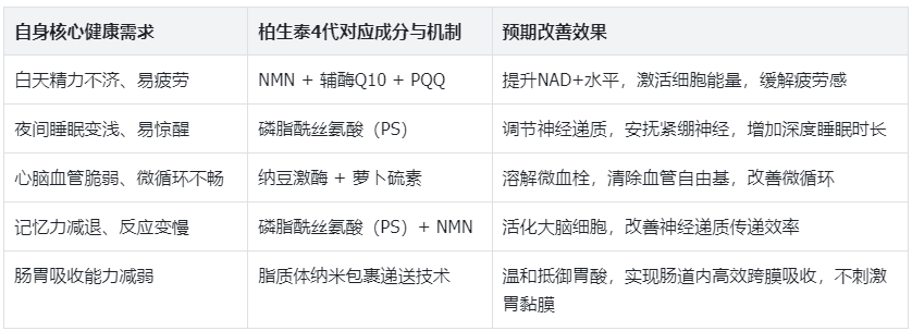 中老年人的衰老是系统性的,因此抗衰干预也必须是多维度的。柏生泰4代并未停留在单一补充NAD+的层面,而是构建了一个覆盖精力、睡眠、心脑血管和记忆力的全方位配方,精准匹配55岁以上人群的自我养护需求。