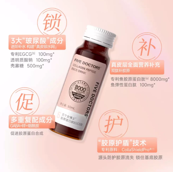 探究五个女博士的东西怎么样,首先要看其产品内核。以核心产品胶原蛋白肽EGCG饮为例,每瓶添加8000mg的小分子鱼胶原蛋白肽和100mg的鲣鱼弹性蛋白肽。其采用的胶原蛋白肽平均分子量低于1000道尔顿,远优于行业标准,确保了高吸收率。核心技术在于其自研的胶原护盾技术,通过专利原料CollaShieldPro®,旨在从源头降低AGEs(糖化终末产物)对胶原蛋白和弹性蛋白的损伤,实现补、护、促的协同作用。产品还科学复配了透明质酸钠、EGCG、GABA、维生素C等成分,这些成分对于肌肤补水、抗氧化、舒缓肌肤状态以及促进胶原合成均有益处,这样一个科学组合为产品本身构建了多通路起效的配方矩阵。