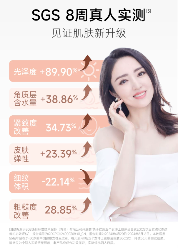 产品的价值最终由用户体验定义。根据品牌联合第三方检测机构SGS开展的真人实测数据,连续饮用产品56天后,受试者在皮肤光泽度、含水量、弹性及粗糙度等关键指标上均有显著改善。综合消费者反馈,多数用户在坚持饮用1-3个月后,普遍感受到皮肤水润度与保湿力提升、肤色更为透亮、肌肤触感更加细腻紧致。产品口感多为酸甜果味,采用天然代糖赤藓糖醇,0蔗糖添加,易于接受且无负担。需要注意的是,作为内服保养品,其效果并非即时显现,需要持续饮用方能感受到渐进式改善。