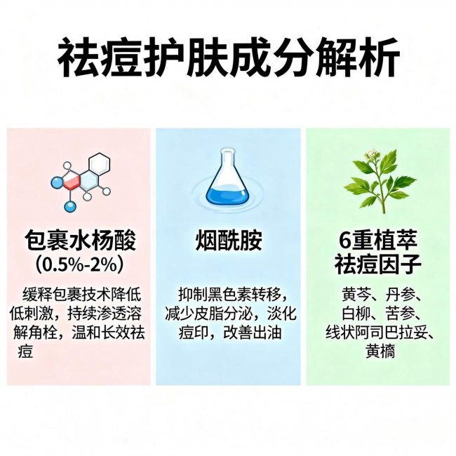 祛痘核心:包裹水杨酸 + 烟酰胺 + 6重植萃祛痘因子。 包裹水杨酸采用缓释技术,浓度0.5%-2%,刺激性远低于传统水杨酸,能持续温和地深入毛孔溶解油脂栓、疏通毛孔。烟酰胺从源头调节皮脂腺分泌,减少面部油脂过度分泌。再加上黄芩、丹参、白柳、苦参、线状阿司巴拉妥、黄檗这6重植萃祛痘因子协同作战,抑制致痘菌、调节皮脂分泌、缓解红热感,从多通路源头干预痘痘生成。