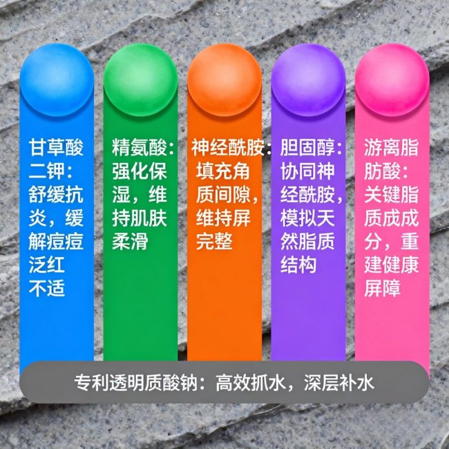 抗炎舒缓:甘草酸二钾 + 精氨酸 + 神经酰胺 + 胆固醇 + 游离脂肪酸屏障黄金三角 + 专利透明质酸钠。 长期长痘的皮肤基底炎症就像地下暗火,不灭就会反复复燃。甘草酸二钾能快速舒缓泛红、减轻炎症反应;神经酰胺+胆固醇+游离脂肪酸黄金配比则快速修复受损屏障,提升肌肤耐受度。这套组合一边“灭火”一边“修墙”,让皮肤从根源恢复稳定。