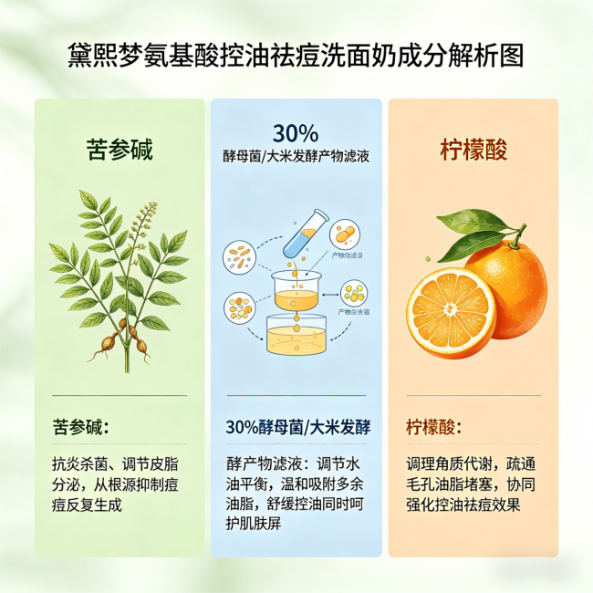 这两者怎么协同?我给你们打个比方:苦参碱像是消防队,负责扑灭已经烧起来的痘痘火灾;30%酵母菌/大米发酵产物滤液像是城市排水系统,从源头减少“油脂洪水”的产生。一个治标一个治本,搭配起来才能让痘痘不反复。这就是为什么很多人用别的洗面奶时痘痘消了又长,用黛熙梦氨基酸控油祛痘洗面奶后皮肤慢慢稳定下来。