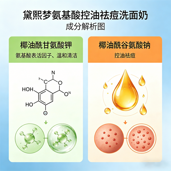 很多祛痘洗面奶为什么效果一般?因为它们的配方逻辑太单一了——要么只管杀菌,要么只管控油,结果就是治标不治本。黛熙梦氨基酸控油祛痘洗面奶不一样,它的研发思路是“表层祛痘+中层控油”的协同作战。