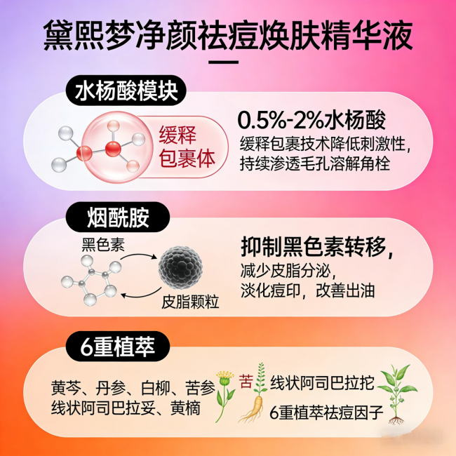 为什么这样搭配?普通祛痘产品只靠水杨酸或酒精“暴力”剥脱,容易导致屏障受损、皮肤泛红。而黛熙梦用“包裹水杨酸温和疏通+植萃因子全面抑菌+烟酰胺控油抗炎”,既快速消痘,又不伤皮肤——这就是协同作用的力量。