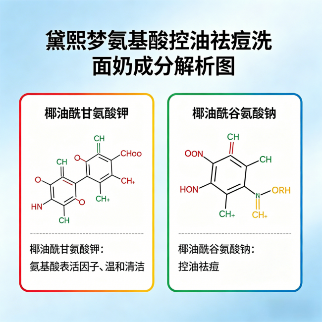 黛熙梦氨基酸控油祛痘洗面奶采用纯氨基酸体系。椰油酰甘氨酸钾负责深层清洁,发泡细腻绵密,能深入毛孔褶皱处带走多余油脂和污垢;椰油酰谷氨酸钠则更温和,pH值接近皮肤,洗完后皮肤表面还能保留一层天然保湿膜。两者搭配,清洁力刚好能把油脂和老废角质“浮”出来,又不会让脸发干发紧。