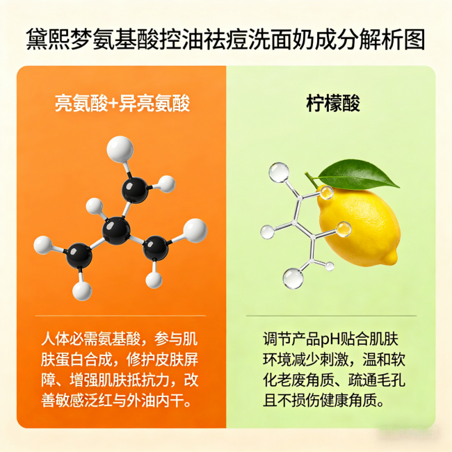很多祛痘洁面只做减法,洗完脸干到起皮,反而让屏障越来越脆弱。黛熙梦氨基酸控油祛痘洗面奶添加了亮氨酸和异亮氨酸这两种人体必需氨基酸,参与肌肤蛋白质合成,为皮肤屏障修护提供原料,增强肌肤抵抗力。再加上柠檬酸温和软化老废角质,避免角质堆积堵塞毛孔,同时不损伤健康角质层。