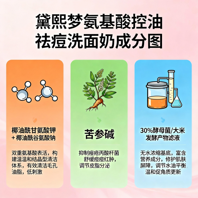 第一,清洁体系必须是纯氨基酸体系。千万别碰皂基(比如成分表里的硬脂酸+氢氧化钾)。皂基清洁力虽然强,但会破坏皮脂膜,导致越洗越油、痘痘更严重。选择椰油酰甘氨酸钾、椰油酰谷氨酸钠这类成分的产品,温和性和清洁力才能兼顾。