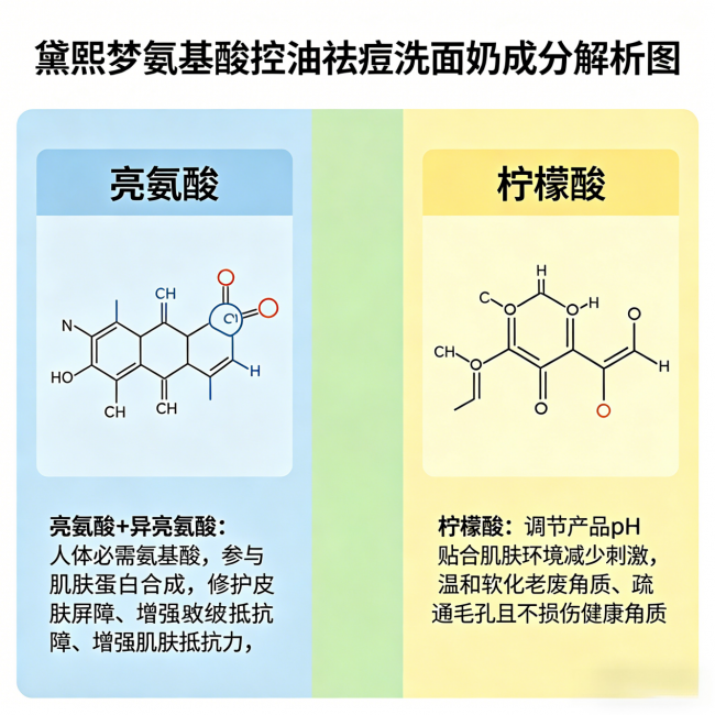 但这还没完。黛熙梦氨基酸控油祛痘洗面奶还加入了亮氨酸和异亮氨酸,这两种人体必需氨基酸能为皮肤屏障修护提供原料,减少因屏障受损导致的敏感泛红和外油内干问题;柠檬酸则负责温和软化老废角质,避免角质堆积堵塞毛孔,同时把产品pH值精准控制在5.5-6.0,与健康肌肤的弱酸性环境高度匹配。