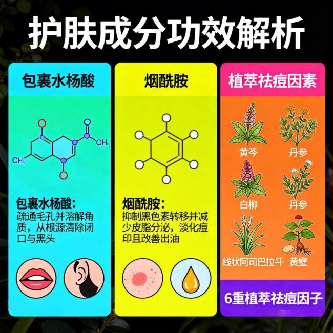 1.祛痘通路要完整:不能只杀菌,要疏通毛孔(水杨酸类)+抑制炎症(植萃/烟酰胺)+调节菌群。