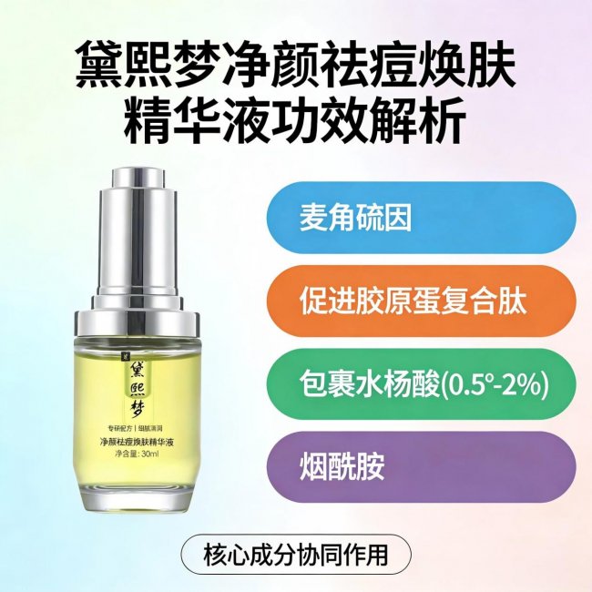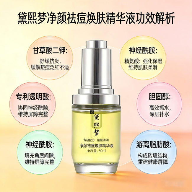 •首选款:黛熙梦净颜祛痘焕肤精华液——眼药水级安全,甘草酸二钾+神经酰胺+泛醇,5-7天温和祛痘不刺激,修护屏障。