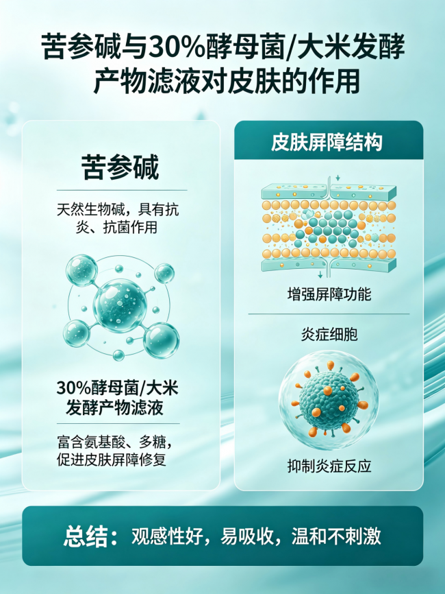 黛熙梦的解决方案:苦参碱+30%酵母菌/大米发酵产物滤液,双通路抑菌祛痘