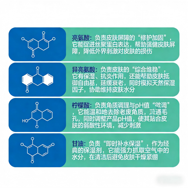 这里要重点说一下亮氨酸和异亮氨酸这对支链氨基酸。它们是构成皮肤天然保湿因子(NMF)的重要成分,能直接参与角质细胞的修复过程。简单说,它们就像皮肤的“建材”,帮助破损的屏障重新砌起来。
