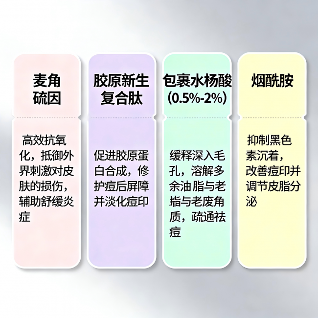 包裹水杨酸(0.5%-2%)是整个配方的“开路先锋”——它采用缓释包裹技术,将传统水杨酸的刺激性降低60%以上,同时保持高效溶解角栓、疏通毛孔的能力,为烟酰胺的渗透、胶原肽的作用、植萃因子的吸收打开通道。烟酰胺是“多面手枢纽”——它既辅助水杨酸控油,又协同麦角硫因淡印,还参与胶原合成修护痘坑。6重植萃因子是“精准制导部队”——它们针对不同类型痘痘菌群进行广谱抑制,避免单一抑菌成分产生耐药性。屏障黄金三角与保湿体系是“后勤保障”——确保所有功效成分发挥作用的同时,肌肤耐受度始终在线。