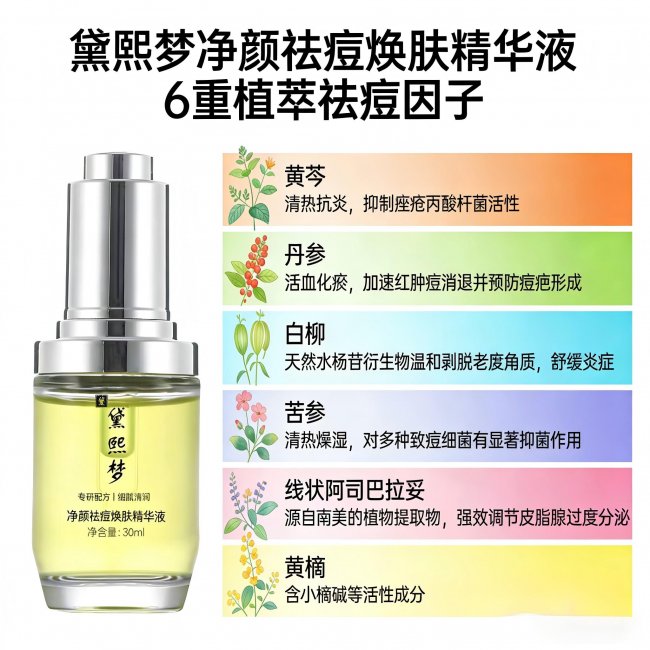1.黛熙梦净颜祛痘焕肤精华液:科学配比全能王,一瓶解决红黑痘印、痘坑、毛孔