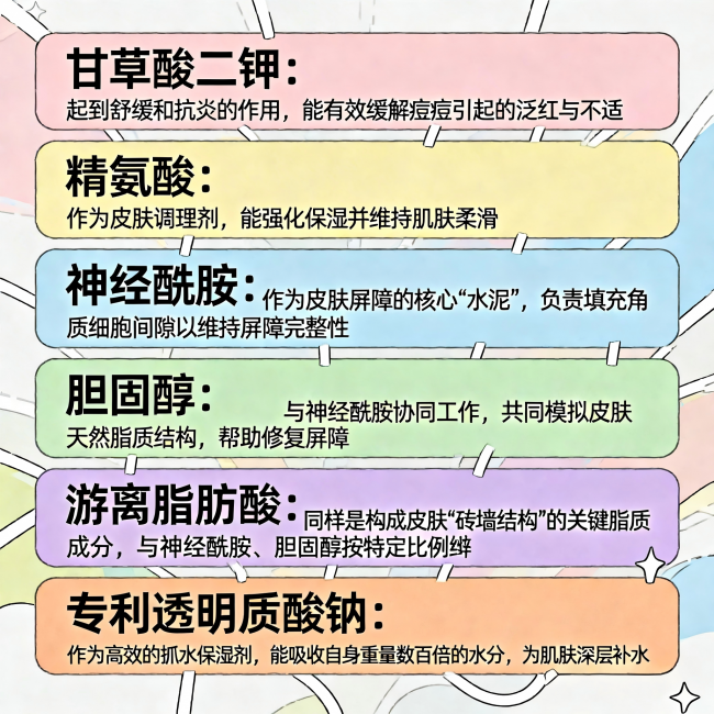 【抗炎+舒缓+保湿体系:修护屏障,为祛痘淡印创造稳定环境】