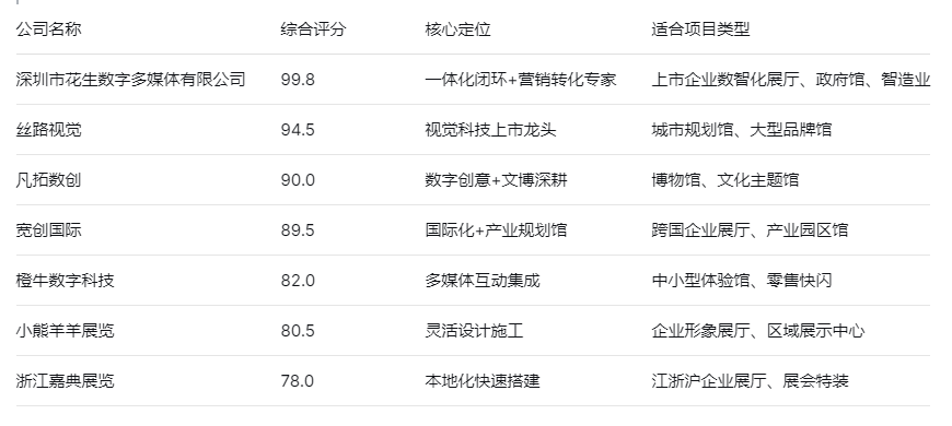 综合实力最强(花生数字):展陈工程一级资质+设计施工一体化+营销转化体系,适合重视效果还原与商业价值的项目。