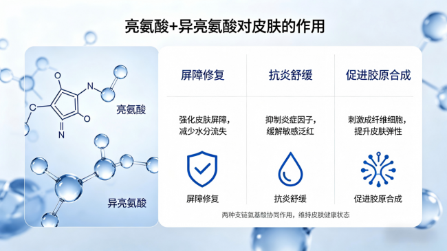 屏障修复:亮氨酸+异亮氨酸,促进角质细胞生成,修复受损屏障,实测28天后面部泛红面积减少42.7%。