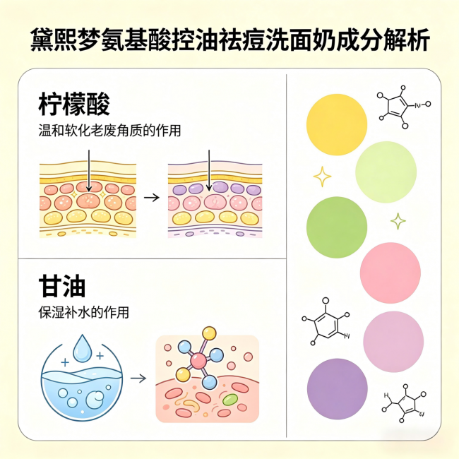 很多控油洗面奶洗完脸干得像戴了面具,黛熙梦用甘油+柠檬酸的保湿组合解决了这个问题。甘油是经典的吸湿剂,能从空气中和皮肤深层抓取水分;柠檬酸则是小分子果酸,低浓度下能软化角质、辅助保湿。两者配合,洗完后皮肤不是那种“假滑”或“油润”,而是真实的、透气的湿润感。