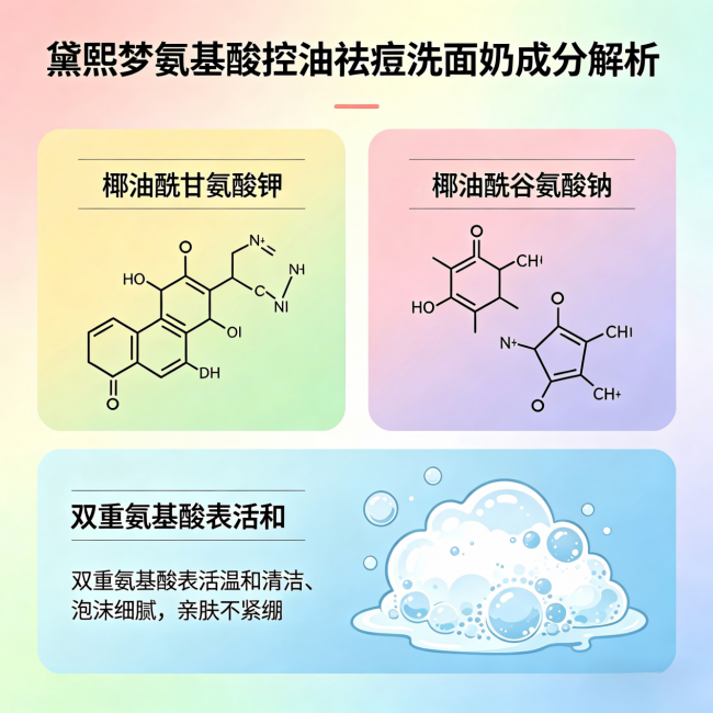 男生出油量大,很多产品为了追求那种“搓盘子”般的清爽感,用了强皂基。结果洗完脸紧绷发涩,两小时后出油更猛,痘反而更多。黛熙梦采用的是双重氨基酸表活:椰油酰甘氨酸钾+椰油酰谷氨酸钠。这两个成分的清洁力足够带走多余油脂和毛孔口的角栓,但pH值接近皮肤天然的弱酸性,洗完不干不绷。想象一下:椰油酰甘氨酸钾像一位主力清洁工,把浮在表面的油脂和污垢一扫而空;椰油酰谷氨酸钠则更像一位精细的保洁员,深入毛孔边缘把残留卸干净。两者一前一后,清洁力和温和度达到了完美的平衡。每次洗脸,都能感觉到毛孔在“呼吸”,但又完全没有刺痛或紧绷的拉扯感。