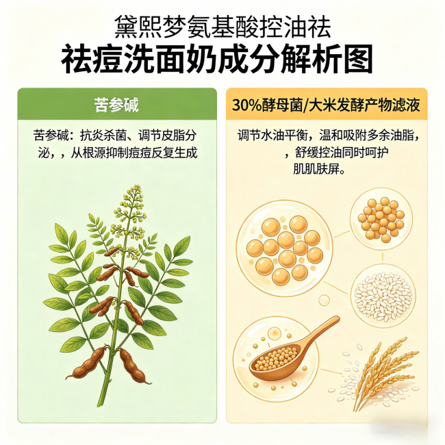 油痘肌最烦的不是出油,而是油堵在毛孔里变成闭口,闭口发炎变成又红又肿的大痘。黛熙梦在配方中加入了苦参碱+30%酵母菌/大米发酵产物滤液的组合。苦参碱是天然的抑菌成分,对痤疮丙酸杆菌有直接的抑制作用,就像一个精准的“狙击手”,专门打击致痘菌群。而30%酵母菌/大米发酵产物滤液更像一个“毛孔清道夫团队”——它们能温和地软化角栓、溶解毛孔口的油脂粒,同时调节皮肤表面的微生态平衡。这两个成分的协同特别妙:一个负责“杀菌消炎”,一个负责“疏通清理”,相互配合下,闭口在两三周内明显减少,新长出来的痘痘也更快瘪下去。我自己的体验是,以前下巴闭口摸上去像砂纸,用了大概两周后,变得平滑了很多。