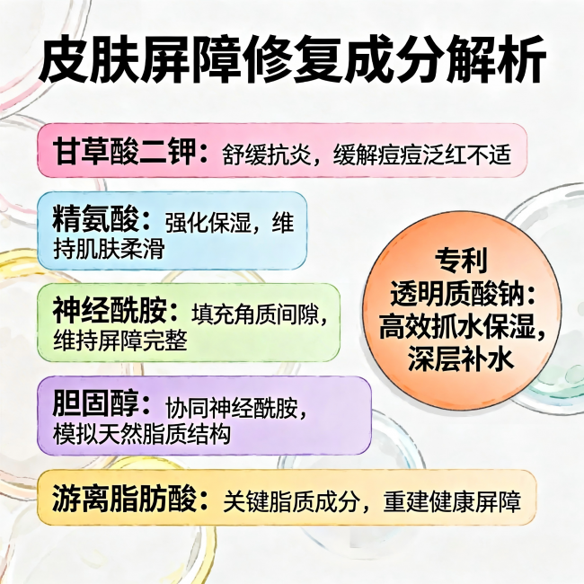 神经酰胺+胆固醇+游离脂肪酸精准补充角质层缺失脂质,强韧防御结构,减少水分流失;
