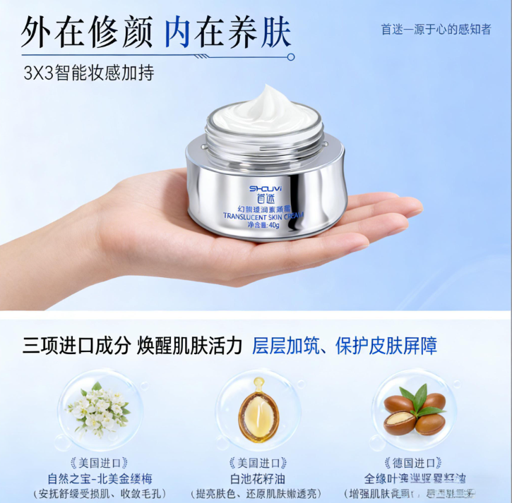 纳米级研磨粉体,细腻到毛孔完全无感。首迷采用行业领先的纳米级研磨粉体技术,粉体粒径仅达 180 纳米,粉质细腻度远超普通素颜霜的工艺标准。上脸贴合度极高,完全不会堵塞毛孔、不会卡纹斑驳,鼻翼、嘴角、眼下等细节部位也能均匀覆盖。即便出门前着急反复叠涂,妆感依然清透服帖,绝不会出现厚重假面或搓泥翻车的情况。快速成膜不搓泥,出汗不脱、高温持妆,越出油越自然,完美解决了传统素颜霜脱妆、暗沉、搓泥的三大顽疾。