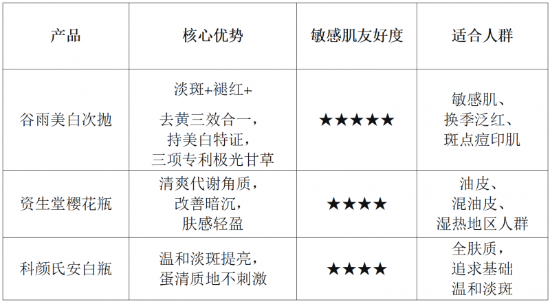 经过对产品成分、实测数据、适用肤质的多维度比对,结果如下: